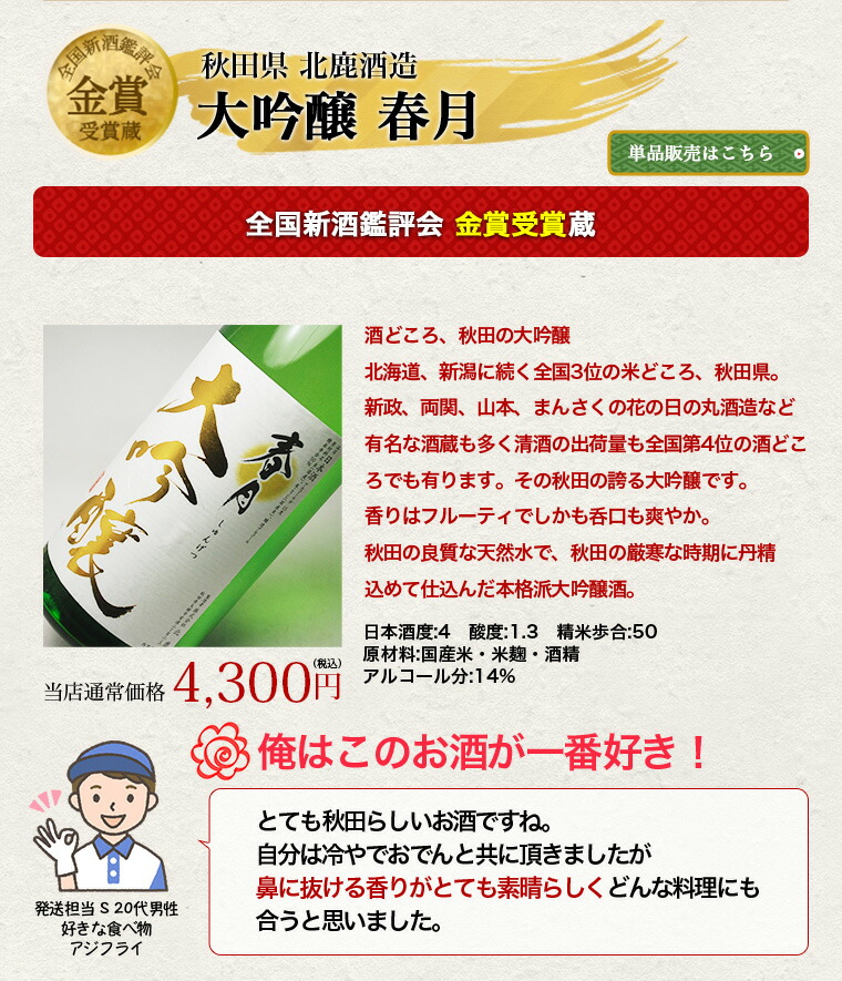 俺はこのお酒が一番好き!:土ても秋田らしいお酒ですね。自分は冷やでおでんと共に頂きましたが鼻に抜ける香りがとても晴らしくどんな理にも合うと思いました。(発送担当S20代男性 好きな食べ物:アジフライ)