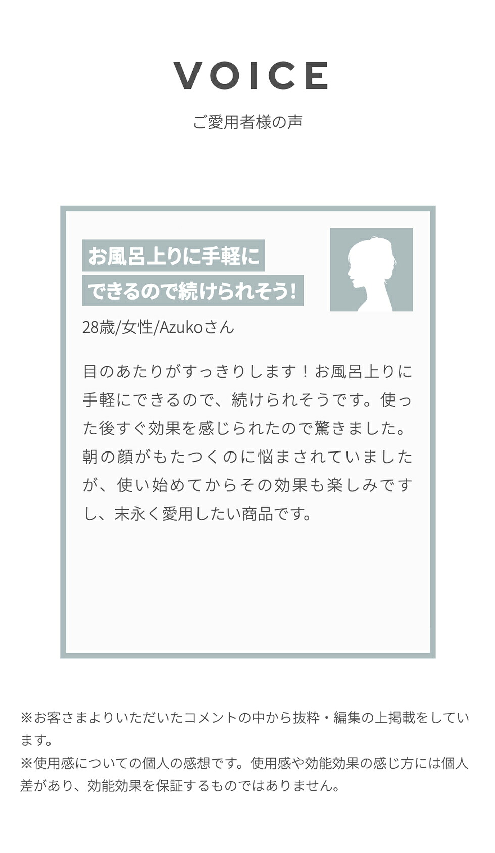 ●途中で気分が悪くなったり肌に異常があらわれた場合は、ただちに使用を中止し、治らない場合は医師に相談する