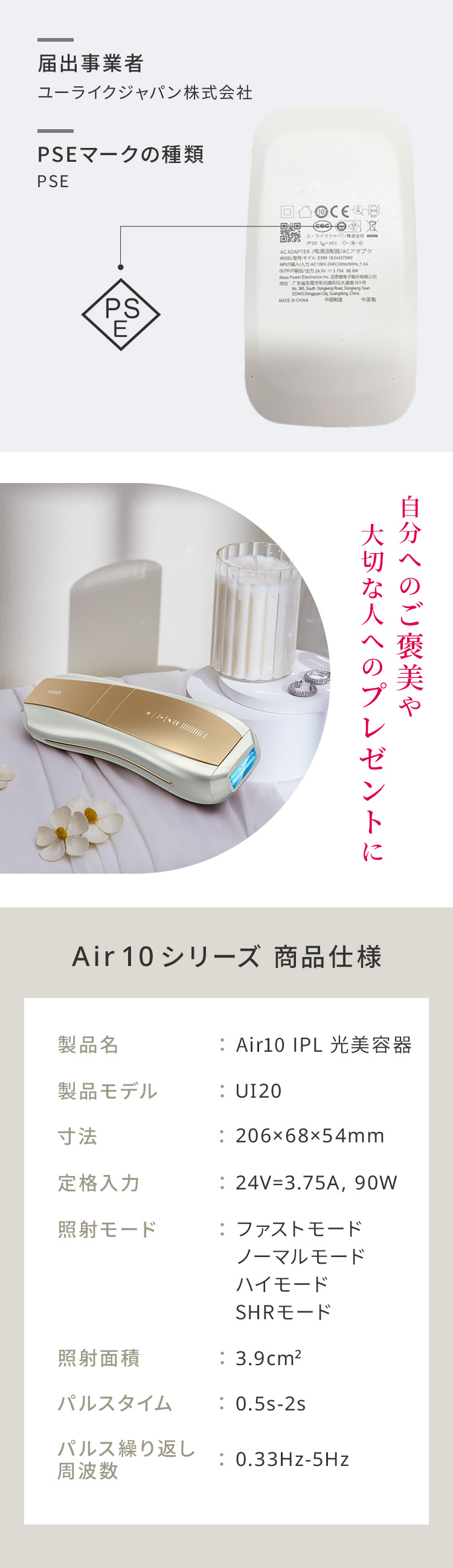 | PSE認証について | PSEマークの種類:特定電気用品 届出事業者名:ユーライクジャパン株式会社 登録検査機関名称:Shenzhen LCS Compliance Testing Laboratory Ltd. |