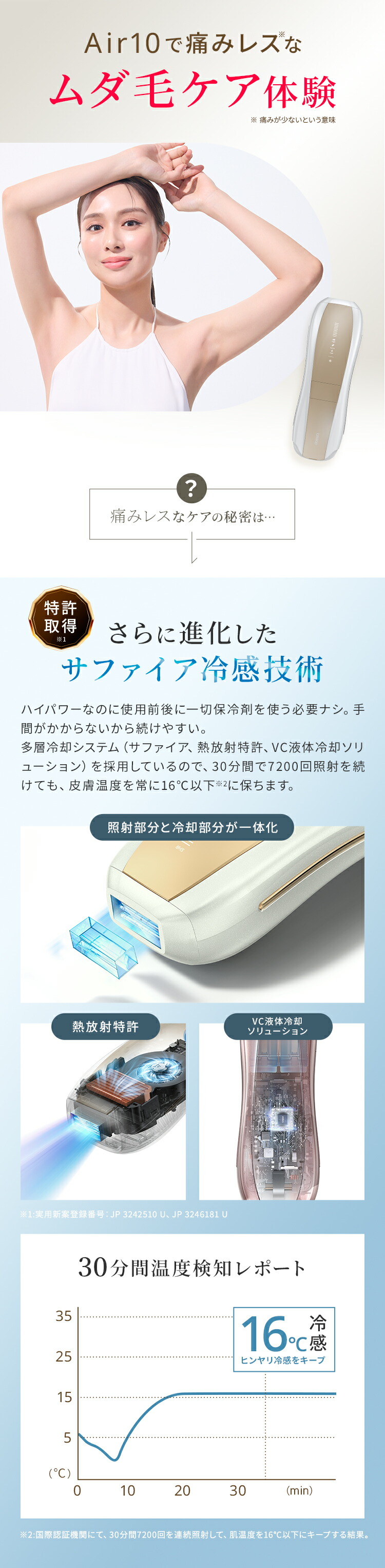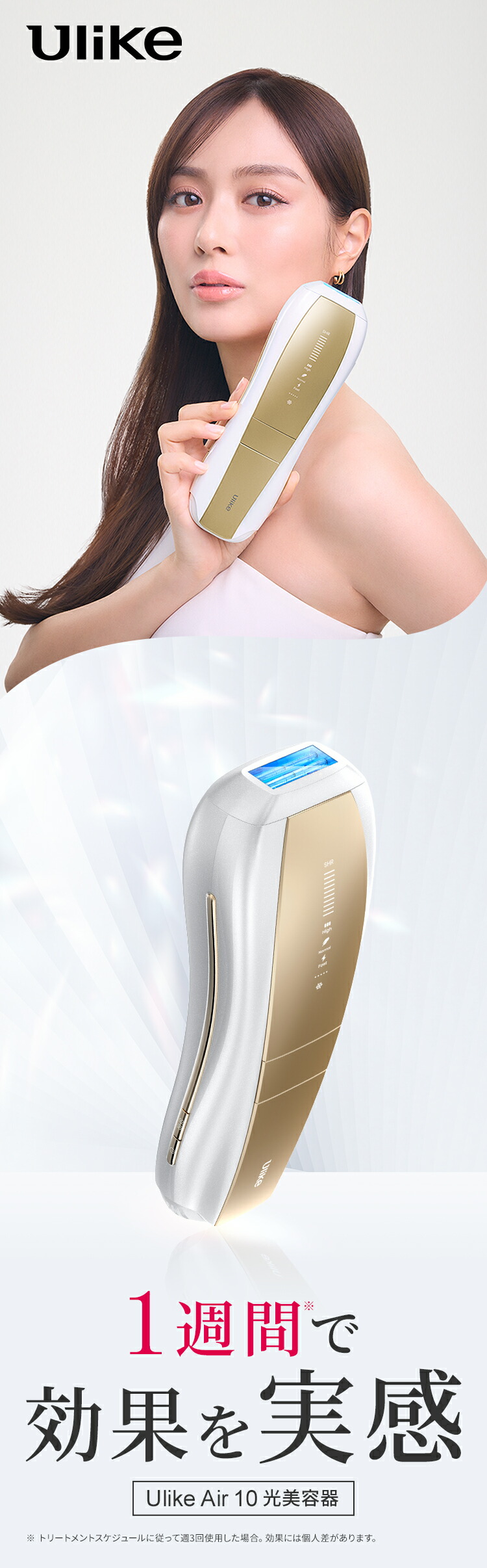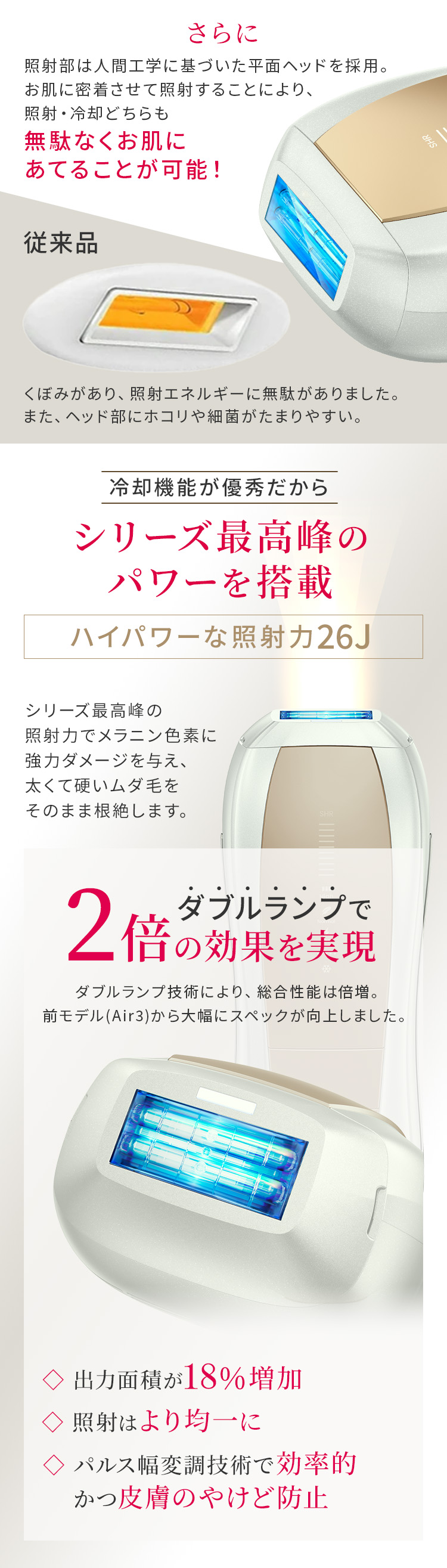 | 【最新サロン級IPL光脱毛器】 前モデル(Air3)から大幅にアップデートをしたAir10。 たった2回で効果を実感することが可能に。 当社最高峰のパワーと最新の冷却機能で、痛みを抑えて効果を実感できます。 【最大出力26J×ダブルランプ技術で効果倍増!】 前モデル(Air3)と比べ、エネルギー出力が26Jとパワーアップ! さらに新搭載のダブルランプ技術で大幅に機能が向上しました。 ・出力面積が18%増加 ・1回の照射でより強いパワー、より広範囲、より深くまで届くように。 ・照射はより均一に ・パルス幅変調技術で効率的かつ皮膚のやけど防止 【特許取得!冷感クールリング機能・痛みレス*】 ハイパワーなのに使用前後に一切保冷剤を使う必要ナシ! 手間がかからないから続けられます。 特許を取得した、Ulike独自のサファイア冷感技術で照射面を当てると同時に冷やすことが可能。 多層冷却システムを採用しているので、30分間7200回照射を続けても、皮膚温度を常に16℃以下*に保ちます。 ※痛みの感じ方には個人差があります。 ※国際認証機関にて、30分間7200回を連続照射して、肌温度を16℃以下にキープする結果。 【最短0.25秒間隔*の高速照射で時短ケア】 最短0.25秒間隔で光を高速照射する自動フラッシュ機能搭載。照射口の面積が当社従来品よりも広くなったため、より無駄なく効率的なケアが可能に。 脚など広い範囲でもスムーズにお手入れできます。 ※国際認証機関CVCにより、SHRモードで1秒に4回フラッシュする際の平均間隔を0.25sとした結果。 【新搭載のSHR*モード】 SHRモードは、エステサロンのムダ毛ケアにも採用されている、ハイパワーの光を肌への刺激を抑えながら高速連射できるモードです。 たとえば30J(ジュール)の光を、10J+10J+10Jに分割して連射することで、一括で照射するよりも肌への刺激を減らすことが可能です。 ※Strong Hair Removal 【充実のセット内容!プレゼントにもおすすめ】 パッケージ内容:Ulike Air10 IPL光美容器 1台/取扱説明書/クイックスタートガイド/専用収納袋/アダプター/ゴーグル保護メガネ/電源コード/カミソリ プレゼントとして贈った場合も、カミソリが同梱されているためすぐにムダ毛ケアが始められます。 使用方法や注意点などは、取扱説明書に記載されています。 【安心の2年保証】 お買い上げ日から2年間の保証を提供いたします。保証期間内に万が一、製品の部品および構造に欠陥があった場合、無償対応させていただきます。 |