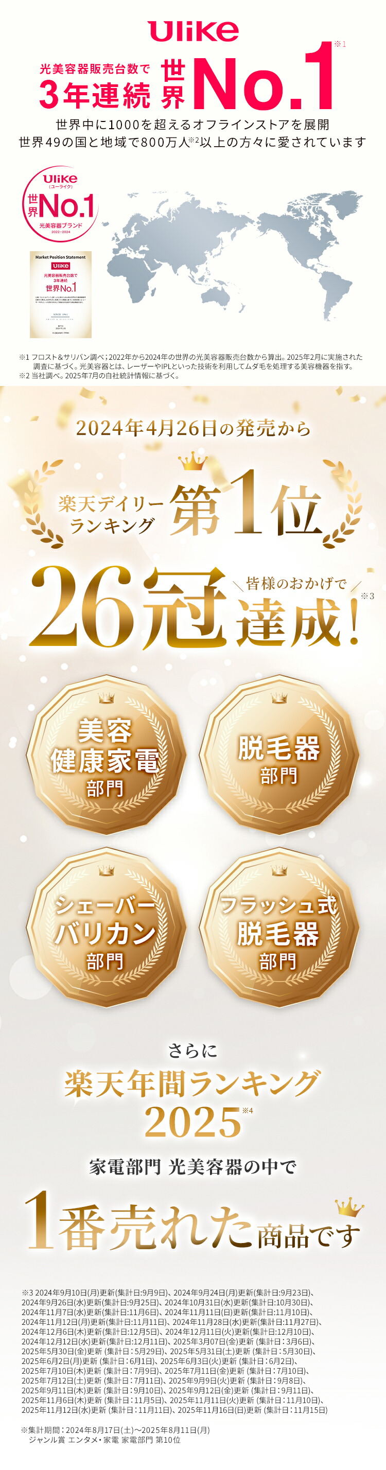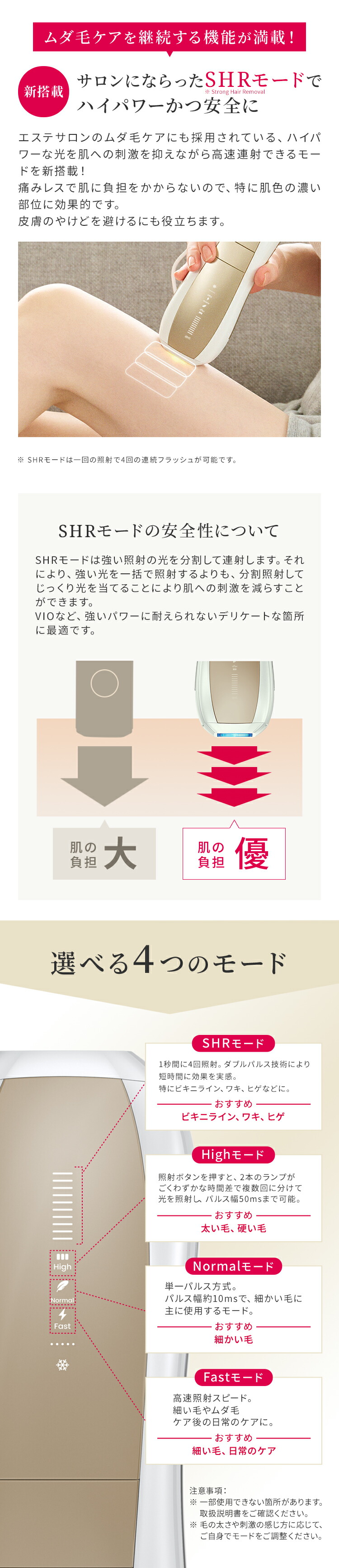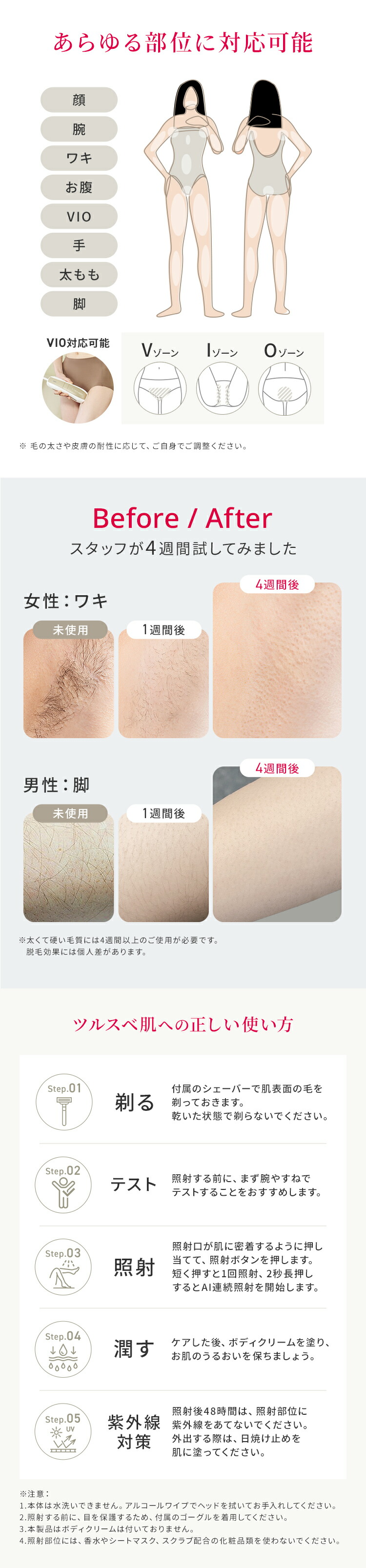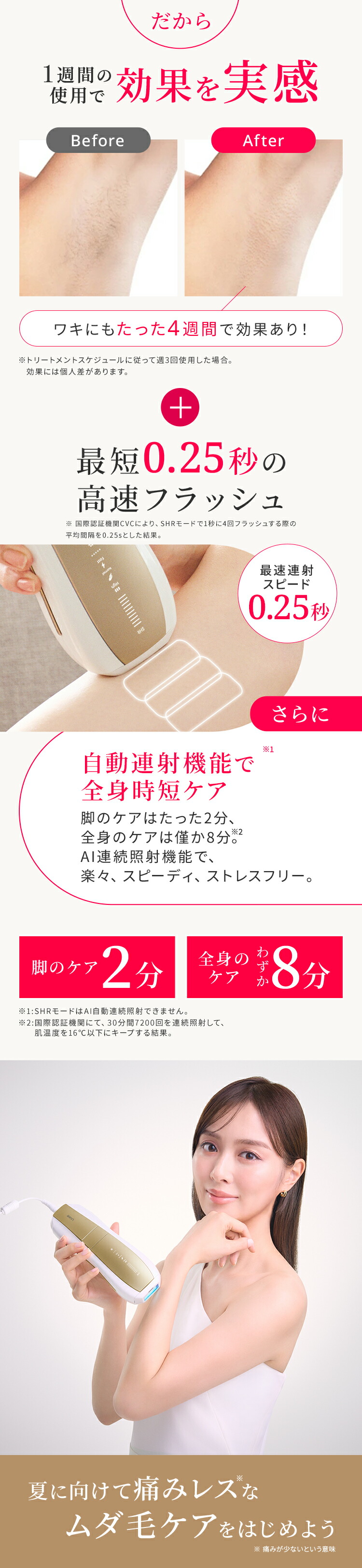 | 【最新サロン級IPL光脱毛器】 前モデル(Air3)から大幅にアップデートをしたAir10。 たった2回で効果を実感することが可能に。 当社最高峰のパワーと最新の冷却機能で、痛みを抑えて効果を実感できます。 【最大出力26J×ダブルランプ技術で効果倍増!】 前モデル(Air3)と比べ、エネルギー出力が26Jとパワーアップ! さらに新搭載のダブルランプ技術で大幅に機能が向上しました。 ・出力面積が18%増加 ・1回の照射でより強いパワー、より広範囲、より深くまで届くように。 ・照射はより均一に ・パルス幅変調技術で効率的かつ皮膚のやけど防止 【特許取得!冷感クールリング機能・痛みレス*】 ハイパワーなのに使用前後に一切保冷剤を使う必要ナシ! 手間がかからないから続けられます。 特許を取得した、Ulike独自のサファイア冷感技術で照射面を当てると同時に冷やすことが可能。 多層冷却システムを採用しているので、30分間7200回照射を続けても、皮膚温度を常に16℃以下*に保ちます。 ※痛みの感じ方には個人差があります。 ※国際認証機関にて、30分間7200回を連続照射して、肌温度を16℃以下にキープする結果。 【最短0.25秒間隔*の高速照射で時短ケア】 最短0.25秒間隔で光を高速照射する自動フラッシュ機能搭載。照射口の面積が当社従来品よりも広くなったため、より無駄なく効率的なケアが可能に。 脚など広い範囲でもスムーズにお手入れできます。 ※国際認証機関CVCにより、SHRモードで1秒に4回フラッシュする際の平均間隔を0.25sとした結果。 【新搭載のSHR*モード】 SHRモードは、エステサロンのムダ毛ケアにも採用されている、ハイパワーの光を肌への刺激を抑えながら高速連射できるモードです。 たとえば30J(ジュール)の光を、10J+10J+10Jに分割して連射することで、一括で照射するよりも肌への刺激を減らすことが可能です。 ※Strong Hair Removal 【充実のセット内容!プレゼントにもおすすめ】 パッケージ内容:Ulike Air10 IPL光美容器 1台/取扱説明書/クイックスタートガイド/専用収納袋/アダプター/ゴーグル保護メガネ/電源コード/カミソリ プレゼントとして贈った場合も、カミソリが同梱されているためすぐにムダ毛ケアが始められます。 使用方法や注意点などは、取扱説明書に記載されています。 【安心の2年保証】 お買い上げ日から2年間の保証を提供いたします。保証期間内に万が一、製品の部品および構造に欠陥があった場合、無償対応させていただきます。 |