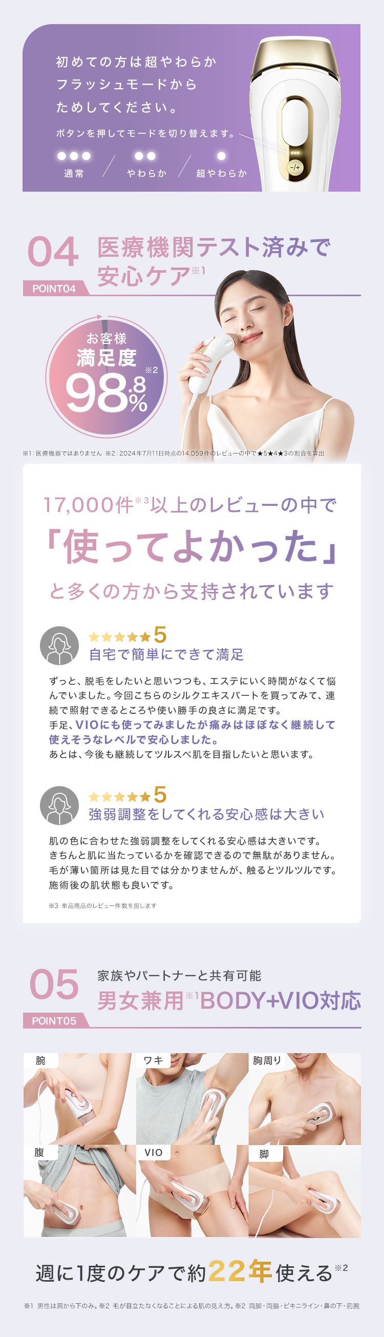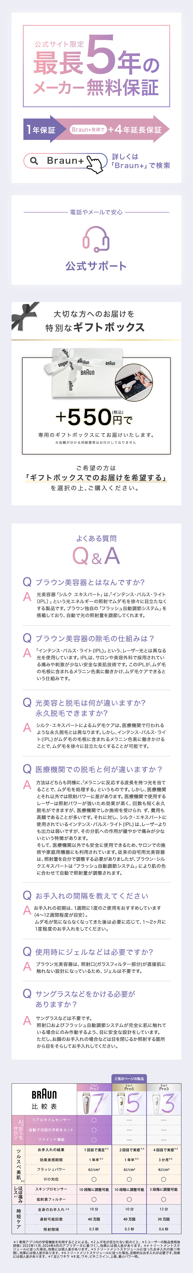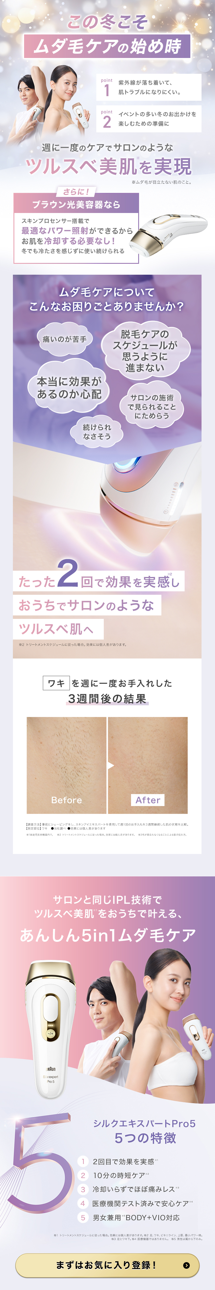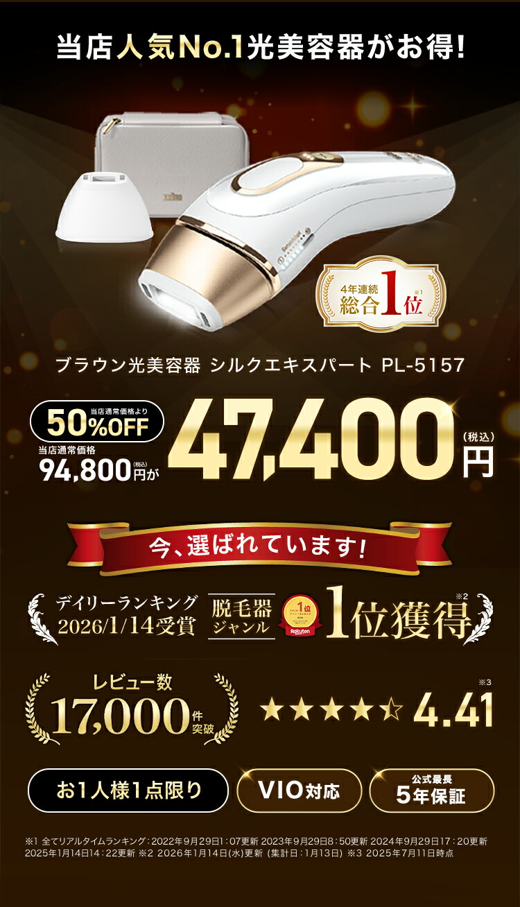 脱毛器・光美容器を手掛けるBRAUN ブラウン広告文責:株式会社いつも(0120-823-049)メーカー名:P&Gジャパン合同会社ブランド名:BRAUN ブラウン原産国:イギリス、中国製商品区分:美容機器内容:本体、アダプター、電源コード、コンパクト(部分用)ヘッド、ポーチ(ボックスタイプ)、ジレットヴィーナス女性用カミソリ電源方式:交流式電圧:本体AC100-240V(50/60Hz)型番:PL-5157 (5014、5117、5137、5227、5243、5248、5267、5268、5347、5387と同様の最新モデルのシルクエキスパートPro5です。)備考:男性は鎖骨より上の部分は照射できません。18歳以上から使用可能ですが、妊娠中及び授乳中の方は使用しないでください。詳細はコチラの取扱説明書よりご確認ください。取扱説明書につきましては、「シルクエキスパート Pro5シリーズ」の内容となっておりますため、全ての型番の付属品が記載されております。※記載の付属品と異なる場合がございます。